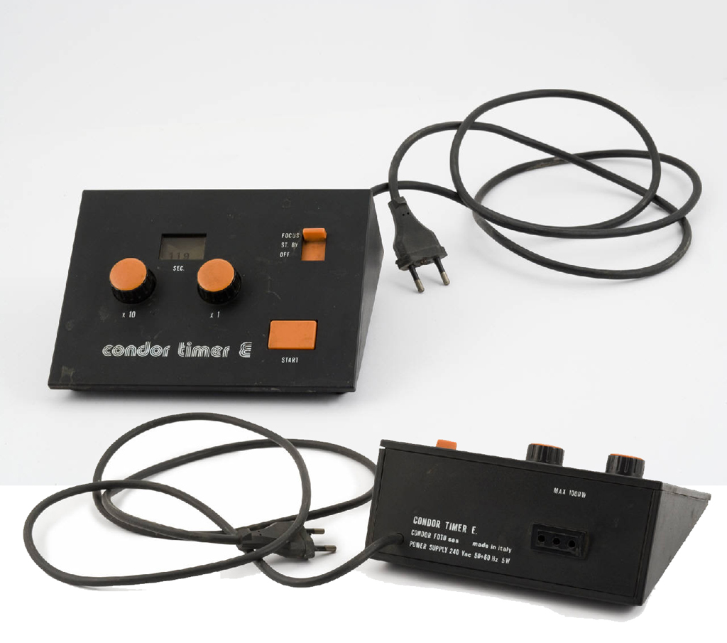 Cominciamo da uno dei modelli più diffusi in Italia, quello della Condor Foto: progettato nel 1965 e fabbricato in Italia fino alla fine del 2025, è Timer elettronico da tavolo. La faccia superiore contenente i comandi d'uso è inclinata per facilitare la visione, poggia su quattro piedini in gomma. La scala per la lettura dei tempi è illuminata da una luce rossa inattinica Collegati ai dispositivi a transistor interni, si hanno i comandi d'uso. Un deviatore a slitta con tre posizioni: focus, stand by e off. Un tasto per l'avvio (start), due commutatori per impostare il tempo (da 10 a 110 secondi e da 0 a 9 secondi). Il tasto "Focus" permette il posizionamento della carta o la messa a fuoco del negativo sul piano di ingrandimento. Dal retro fuoriesce il cavo di alimentazione da connettere alla rete elettrica, con protezione con fusibile interno.. Caratteristiche tecniche: Tempi: da 0.5 a 119 sec. Precisione della temporizzazione ± 2% su tutte le scale. Ripetibilità dei tempi immediata. A differenza di altri Timer non è possibile vedere sulla scala dei tempi, durante l’esposizione, il countdown del tempo trascorso. Oggi è reperibile solo usato