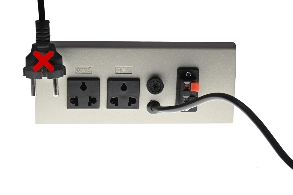 Notate che ci sono gli ingressi per due prese che non vanno mai confusi: quella a sinistra è quella deputata al collegamento del cavo dell’ingranditore ( freccia bianca ) quella a destra è deputata al collegamento della o delle lampade di sicurezza ( freccia rossa ) notate poi l’alloggiamento del fusibile, il cavo di alimentazione con spina Schuko - se anziché usare un adattatore per la vostra presa a muro la sostituite con una spina di tipo C (europea a due poli) o Tipo L (italiana a tre poli ) la garanzia del prodotto decade - che va inserito nella presa di corrente a muro e due ingressi, nero e rosso la cui funzione non è chiara, ovvero se può essere collegato a un pedale di accensione ( in una schema di istruzioni viene infatti definito come Foot Switch. Personalmente, non essendo riuscito a trovare alcuna informazione certa, vi esorto a NON collegare nulla a questo ingresso.