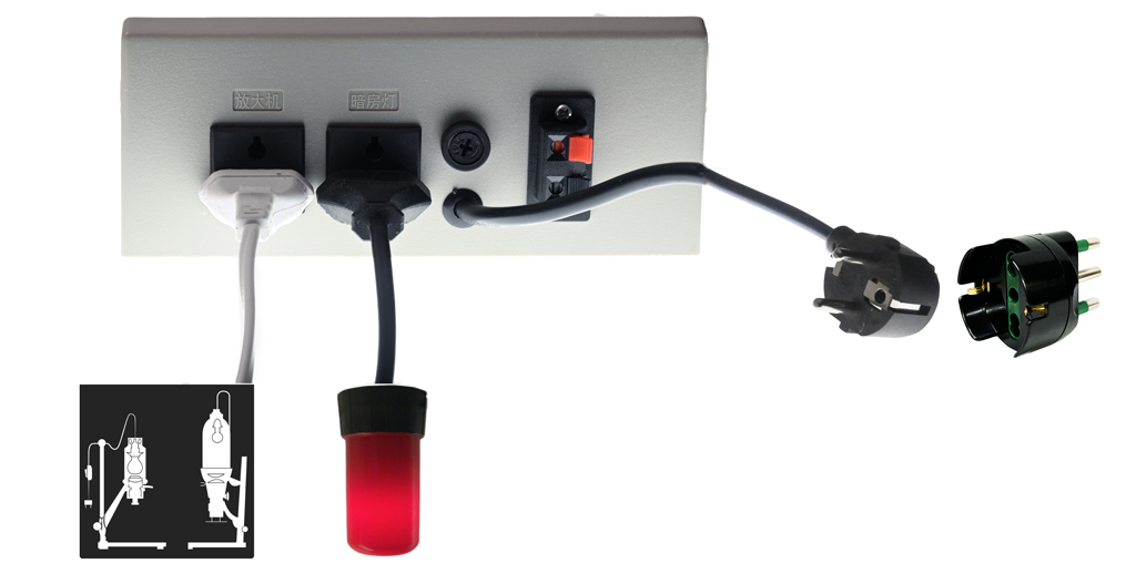 Riassumendo, nella presa di sinistra inserirete il cavo di alimentazione dell’ingranditore o del suo trasformatore, nella presa di destra inserirete il cavo di alimentazione della o delle lampade di sicurezza; il cavo di alimentazione del timer è fornito con una presa Schuko, sarà quindi necessario acquistare un adattatore che deve terminare però con una spina da 10A compatibile con tutte le prese a muro italiane.