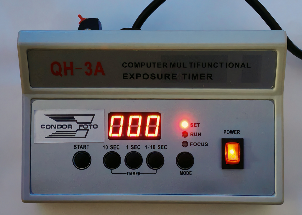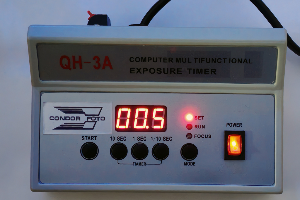 Permette di collegare ingranditore con potenza della lampada fino a 5 Amp. Può essere impostato con tempi da 01, fino a 99 secondi, Il display, una volta partita l’esposizione, permette di vedere il countdown dei secondi e l’esposizione può anche essere arrestata, per esempio per prepararsi a una mascheratura o bruciatura, per poi, una volta premuto nuovamente il pulsante, partire dal tempo di esposizione restante. Non permette di collegare le lampade inattiniche della camera oscura per il loro spegnimento automatico durante l’esposizione. ( prezzo intorno ai € 245 )