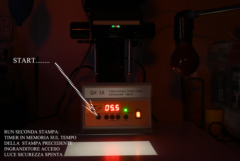 Timer in memoria sul tempo della stampa precedente, premere START, l’ ingranditore si accende, luce di sicurezza spenta