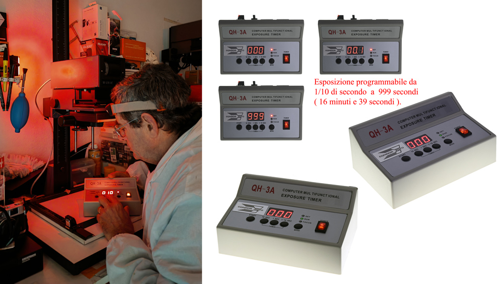 Il timer, oltre che comodo, e nel caso del modello di cui ho maggiormente parlato, con la possibilità di spegnere in automatico le luci di sicurezza sia durante la fase della messa a fuoco che della esposizione, è uno strumento importante, perchè il tempo che si arriva a decidere durante la fase del provino, deve corrispondere ESATTAMENTE al tempo con cui si andrà a esporre il foglio di carta
