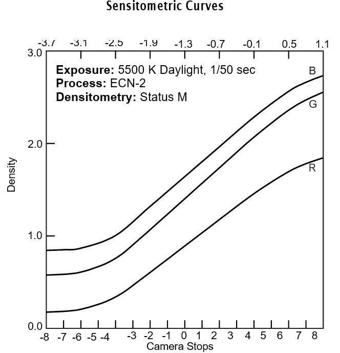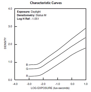 Le curve descrivono la risposta di questa pellicola alla luce rossa, verde e blu. Le curve sensitometriche determinano la variazione di densità sulla pellicola per una data variazione dell'esposizione logaritmica.