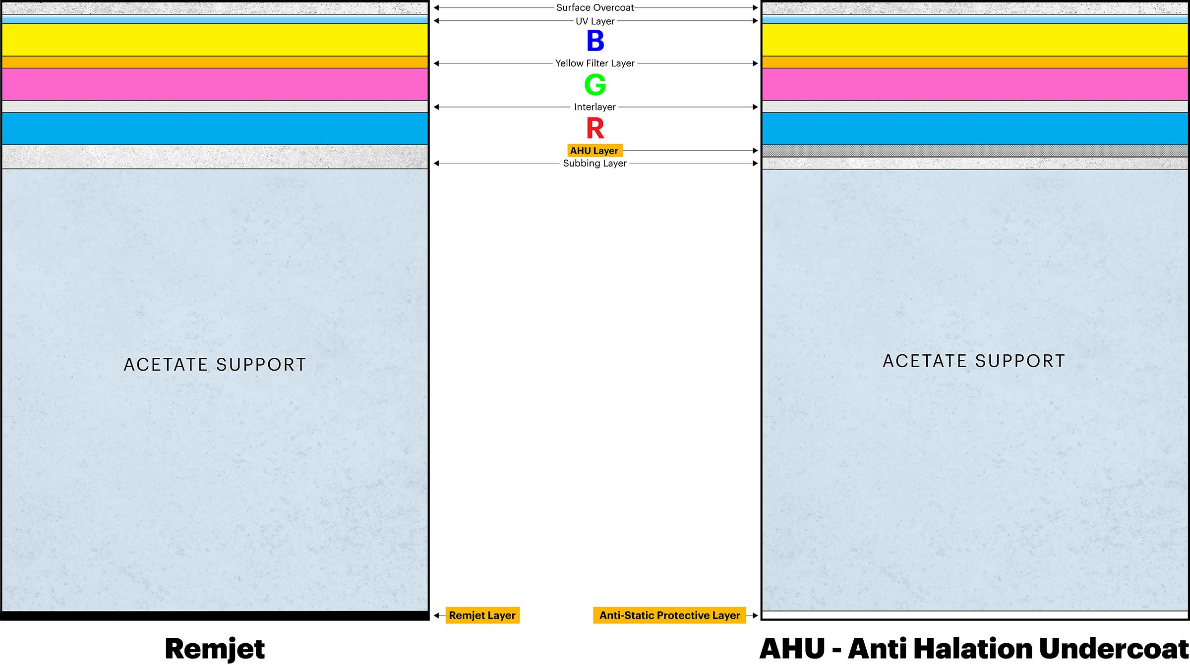 Infine c’è l’aspetto dello strato remjet: Kodak sta introducendo una nuova struttura per pellicole negative da ripresa VISION3, senza più supporto remjet. Questa nuova struttura incorpora uno strato di fondo anti-alone, o "AHU".