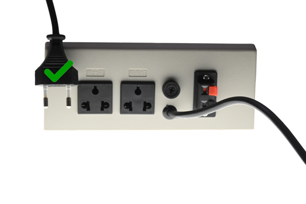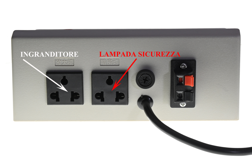 Riassumendo, nella presa di sinistra inserirete il cavo di alimentazione dell’ingranditore o del suo trasformatore, nella presa di destra inserirete il cavo di alimentazione della o delle lampade di sicurezza; il cavo di alimentazione del timer è fornito con una presa Schuko, sarà quindi necessario acquistare un adattatore che deve terminare però con una spina da 10A compatibile con tutte le prese a muro italiane.