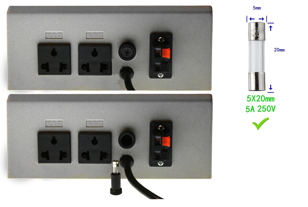 Notate che ci sono gli ingressi per due prese che non vanno mai confusi: quella a sinistra è quella deputata al collegamento del cavo dell’ingranditore ( freccia bianca ) quella a destra è deputata al collegamento della o delle lampade di sicurezza ( freccia rossa ) notate poi l’alloggiamento del fusibile, il cavo di alimentazione con spina Schuko - se anziché usare un adattatore per la vostra presa a muro la sostituite con una spina di tipo C (europea a due poli) o Tipo L (italiana a tre poli ) la garanzia del prodotto decade - che va inserito nella presa di corrente a muro e due ingressi, nero e rosso la cui funzione non è chiara, ovvero se può essere collegato a un pedale di accensione ( in una schema di istruzioni viene infatti definito come Foot Switch. Personalmente, non essendo riuscito a trovare alcuna informazione certa, vi esorto a NON collegare nulla a questo ingresso.