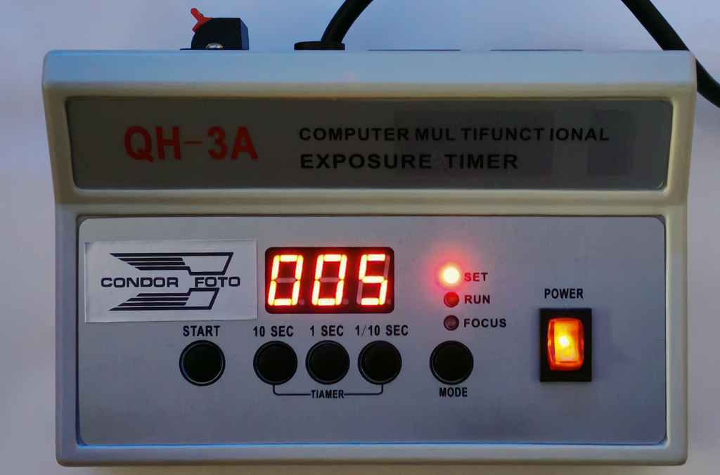 Permette di collegare ingranditore con potenza della lampada fino a 5 Amp. Può essere impostato con tempi da 01, fino a 99 secondi, Il display, una volta partita l’esposizione, permette di vedere il countdown dei secondi e l’esposizione può anche essere arrestata, per esempio per prepararsi a una mascheratura o bruciatura, per poi, una volta premuto nuovamente il pulsante, partire dal tempo di esposizione restante. Non permette di collegare le lampade inattiniche della camera oscura per il loro spegnimento automatico durante l’esposizione. ( prezzo intorno ai € 245 )