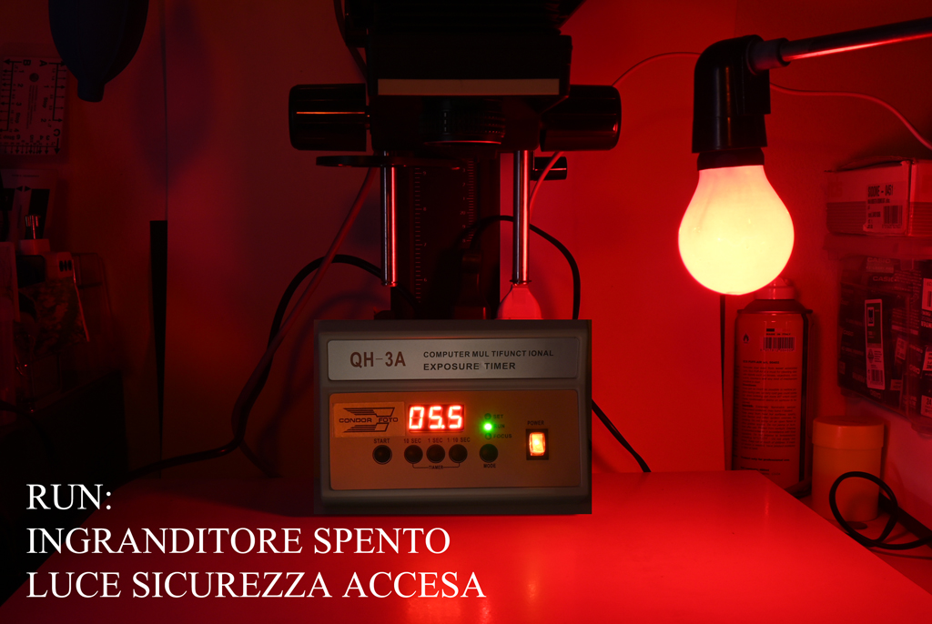 Dopo che il tempo di posa è stato ultimato, l’ingranditore si spegne, luce di sicurezza accesa