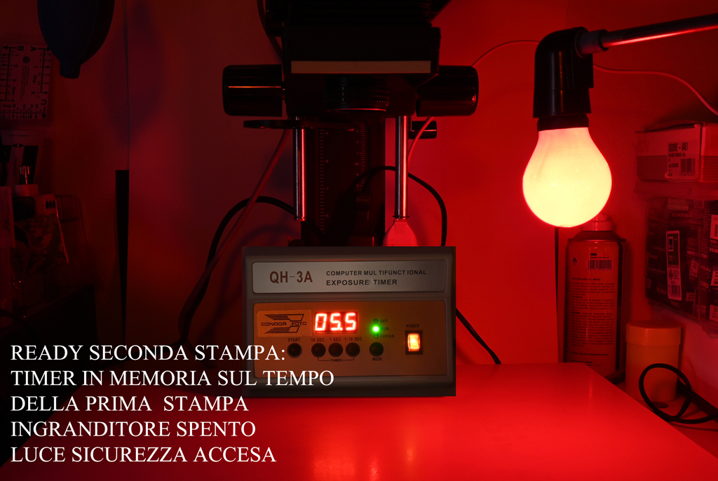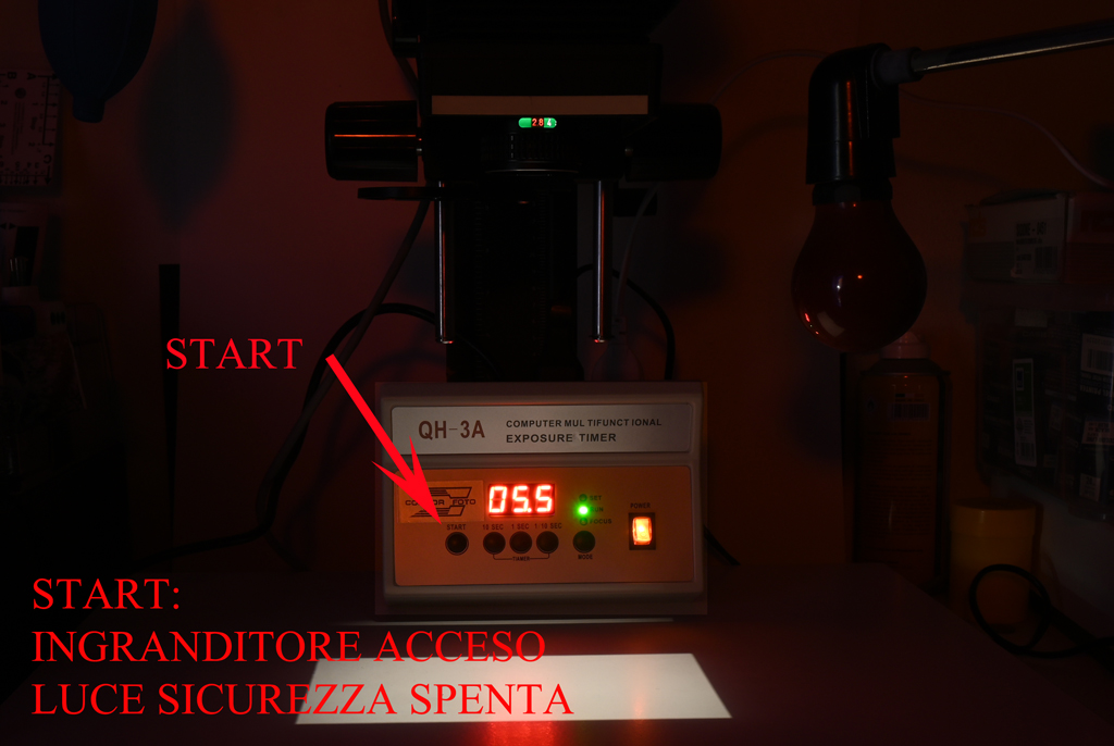 Timer in memoria sul tempo della stampa precedente, premere START, l’ ingranditore si accende, luce di sicurezza spenta