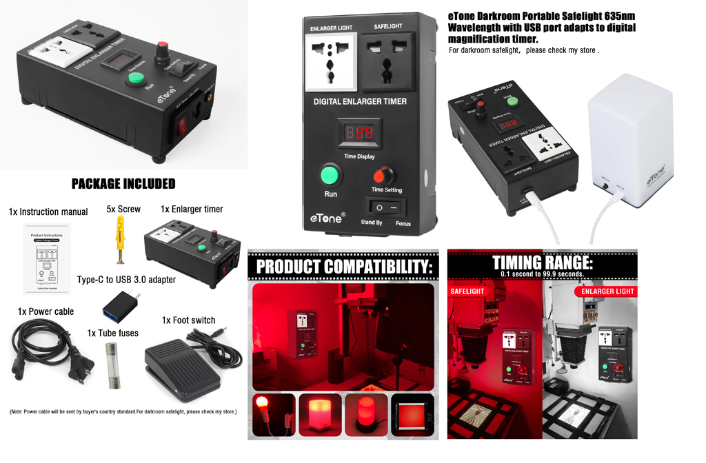 Un timer assolutamente completo, che permette di impostare tempi da 0,1 a 99,9 secondi. Non solo può spegnere e accendere anche le lampade di sicurezza ma è anche dotato di una presa USB per accendere una luce bianca che può essere impostata su inattinica dedicata che può funzionare anche a batterie ed essere impostata tanto su luce di sicurezza che su luce bianca. Può gestire una potenza massima di un lampada da ingranditore da 600W e input di voltaggio da 100 a 240 V, per renderlo così universale; le prese accettano praticamente tutte le spine dei principali paesi del mondo. e può anche essere comandato, come accensione da un comodo pedale con cui è anche possibile interrompere il countdown per mascherature e bruciature. parliamo di 102 dollari se acquistato sul sito proprietario americano, a cui vanno aggiunte ovviamente le spese di spedizione e di sdoganamento.