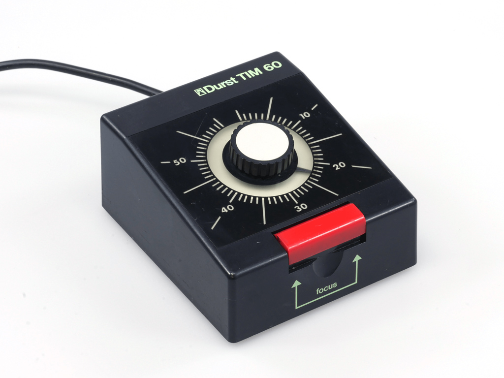 Durst naturalmente ha prodotto una serie molto articolata di timer. Qui presentiamo il Tim 60, un timer in grado di impostare tempi da 1 fino a 60 secondi. Semplice, non permette di comandare le luci di sicurezza, niente countdown visibile durante l’esposizione. Durst ha prodotto anche timer decisamente più professionali dotati anche di sonda per la misurazione dell’esposizione, come il Digitim S 1000 e il Digitim S 3000